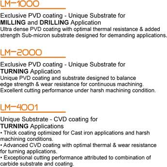LOMAS Cutting Tools provides a standard range of ISO indexable tooling- with a unique range of tools, geometries, sub-micron carbides and multi-purpose PVD and CVD coatings designed to support the entire range of Milling, Drilling and Turning applications to machine many types of raw materials in all areas of industries.